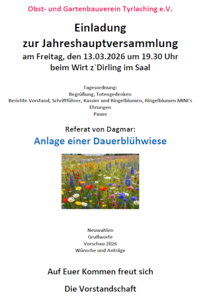 Einladung zur Jahreshauptversammung des Obst- und Gartenbauvereins Tyrlaching 2024